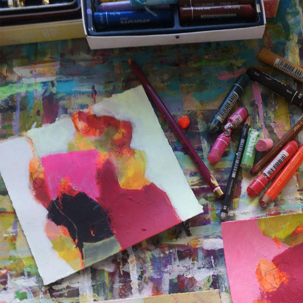 Spontan gesetzte Farbflächen, kontrastreich, lebendig, lebhaft und leidenschaftlich, werden ergänzt und überlagert mit unterschiedlichen Lasuren. Zeichnerische Elemente werden mit eingebunden. Begib dich auf eine Farbabenteuerreise, bei der sich immer wieder Neues zeigt und so ganz individuelle Arbeiten entstehen.