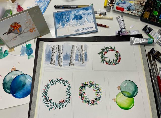 Zu Beginn malen wir Winter- und Weihnachtsbilder (Schneelandschaften, Tannen, Christbaumkugeln usw.), die sich für Grußkarten oder als kleine Geschenke eignen. Danach gestalten wir ca. 8-10 Weihnachtskarten und Pop-Ups. Für Teilnehmer*innen ab 11 Jahren geeignet.