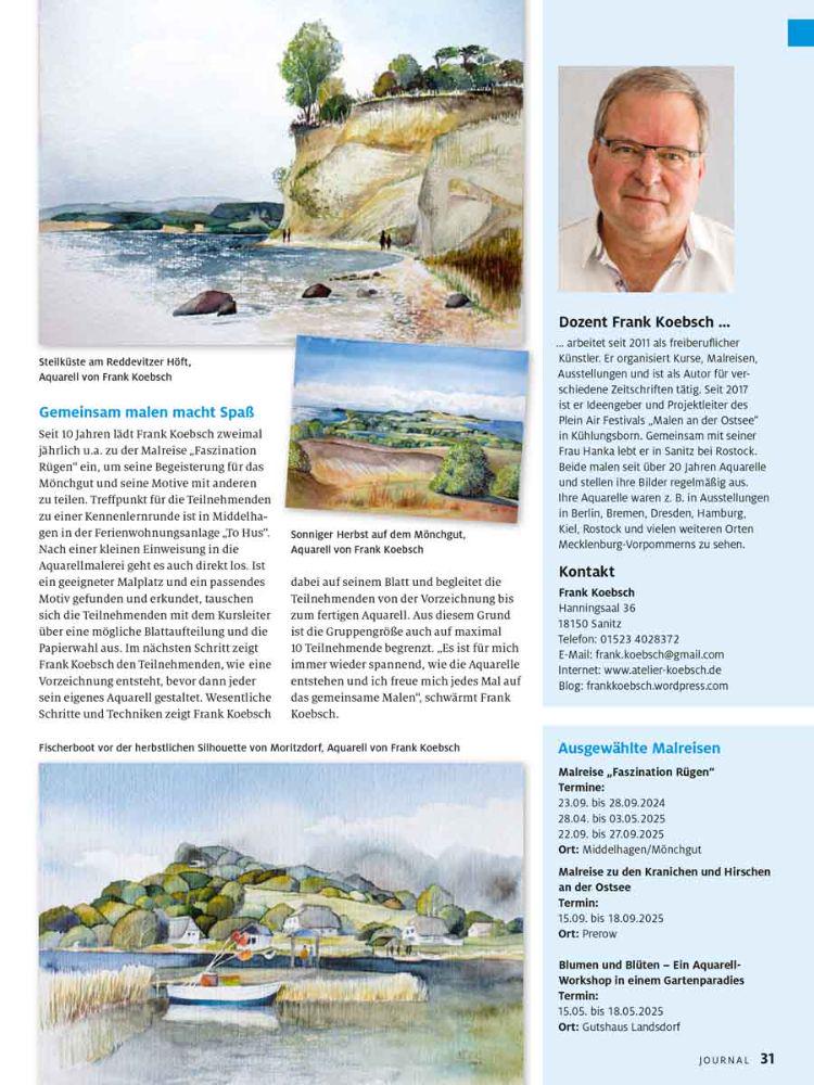 Frank Koebsch lebt gemeinsam mit seiner Frau Hanka in Sanitz bei Rostock. Beide malen seit ca. 20 Jahren Aquarelle und stellen ihre Bilder regelmäßig aus. Ihre Aquarelle waren z.B. in Ausstellungen in Berlin, Bremen, Dresden, Hamburg, Kiel, Rostock und vielen weiteren Orten Mecklenburg – Vorpommerns zu sehen. Frank Koebsch arbeitet seit 2011 als freiberuflicher Künstler und Autor für verschiedene Zeitschriften. Seit 2017 ist er Ideengeber und Projektleiter des Plein Air Festivals „Malen an der Ostsee“ in Kühlungsborn.
