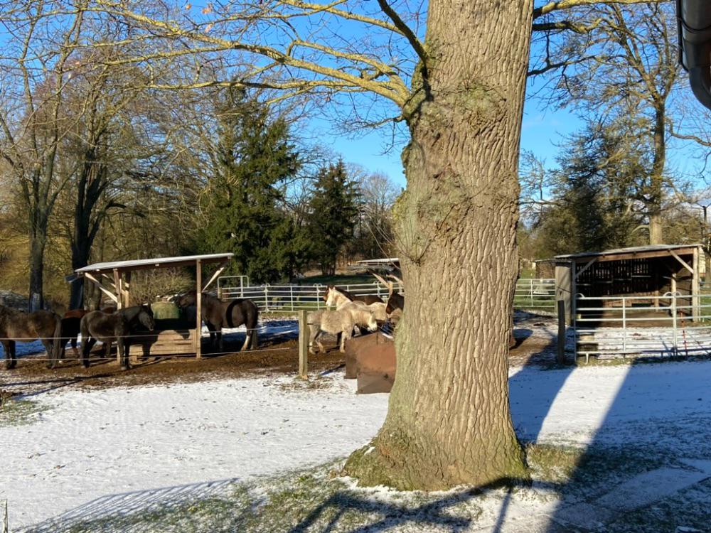 Wir wohnen in drei nebeneinanderliegen Häusern mit Blick in die Natur, Garten und Pferdekoppel. Im Kurspreis enthalten.