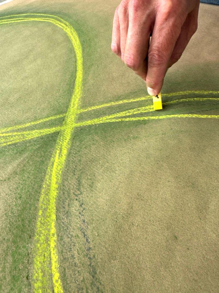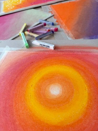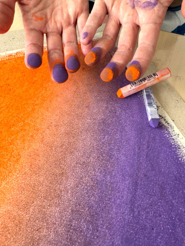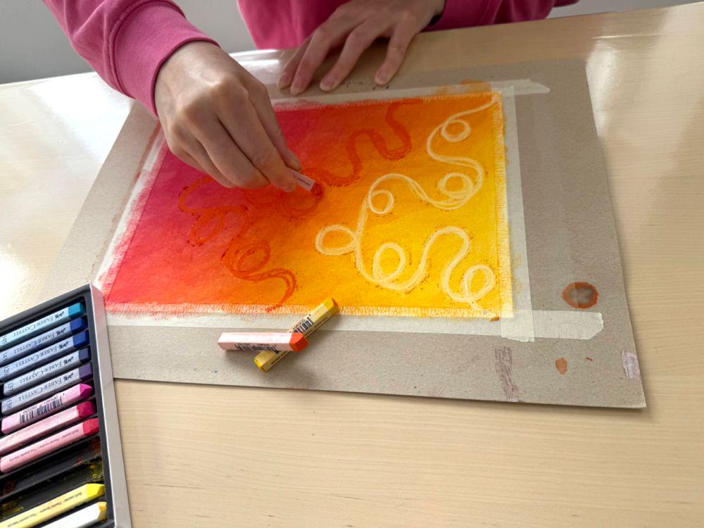 Je nach Thema verwenden wir dabei z. B. Wasserfarben, Pastellkreide oder div. Stifte