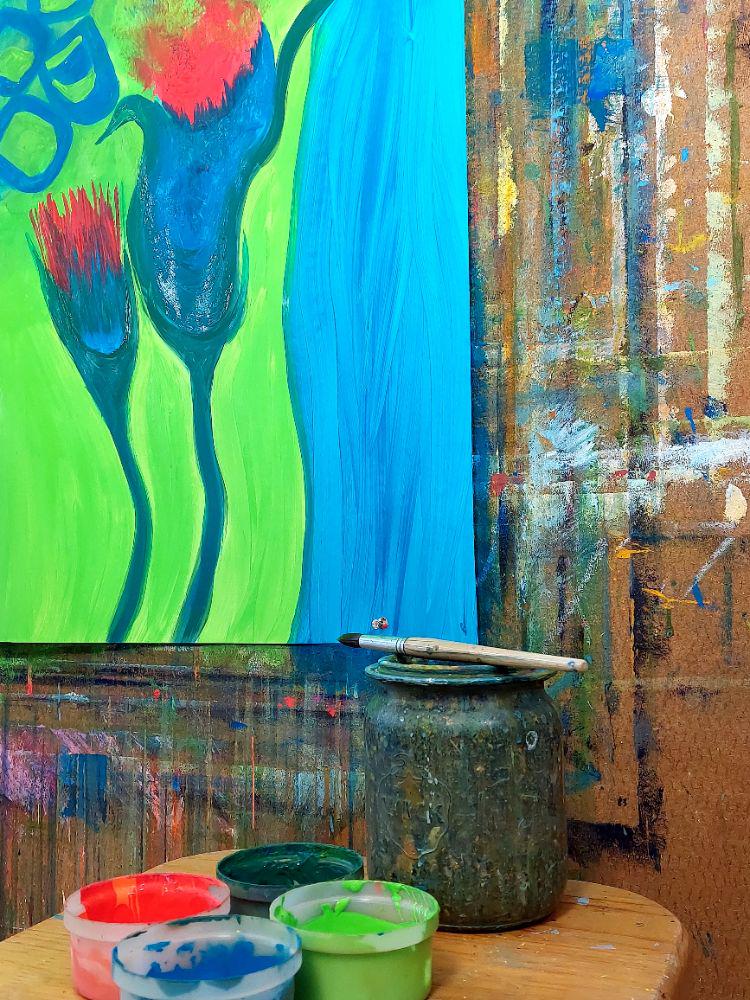 Seit 2013 eigenes Atelier und Kurse im intuitiven Malen. Seit Juli 2022 auf dem Mainzer Layenhof.