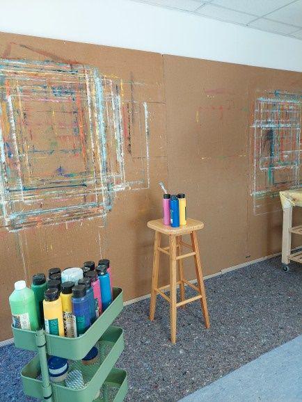 Wir beginnen nach der Begrüßung und der Besprechung der allerwichtigsten, praktischen Dinge (an welcher Wand male ich, welche Farben gibt es, wo sind die Pinsel und Schwämme, wie beginne ich mit malen) direkt mit dem Spiel mit Farben. Damit Du in Ruhe malen und Dir Zeit dafür nehmen kannst.