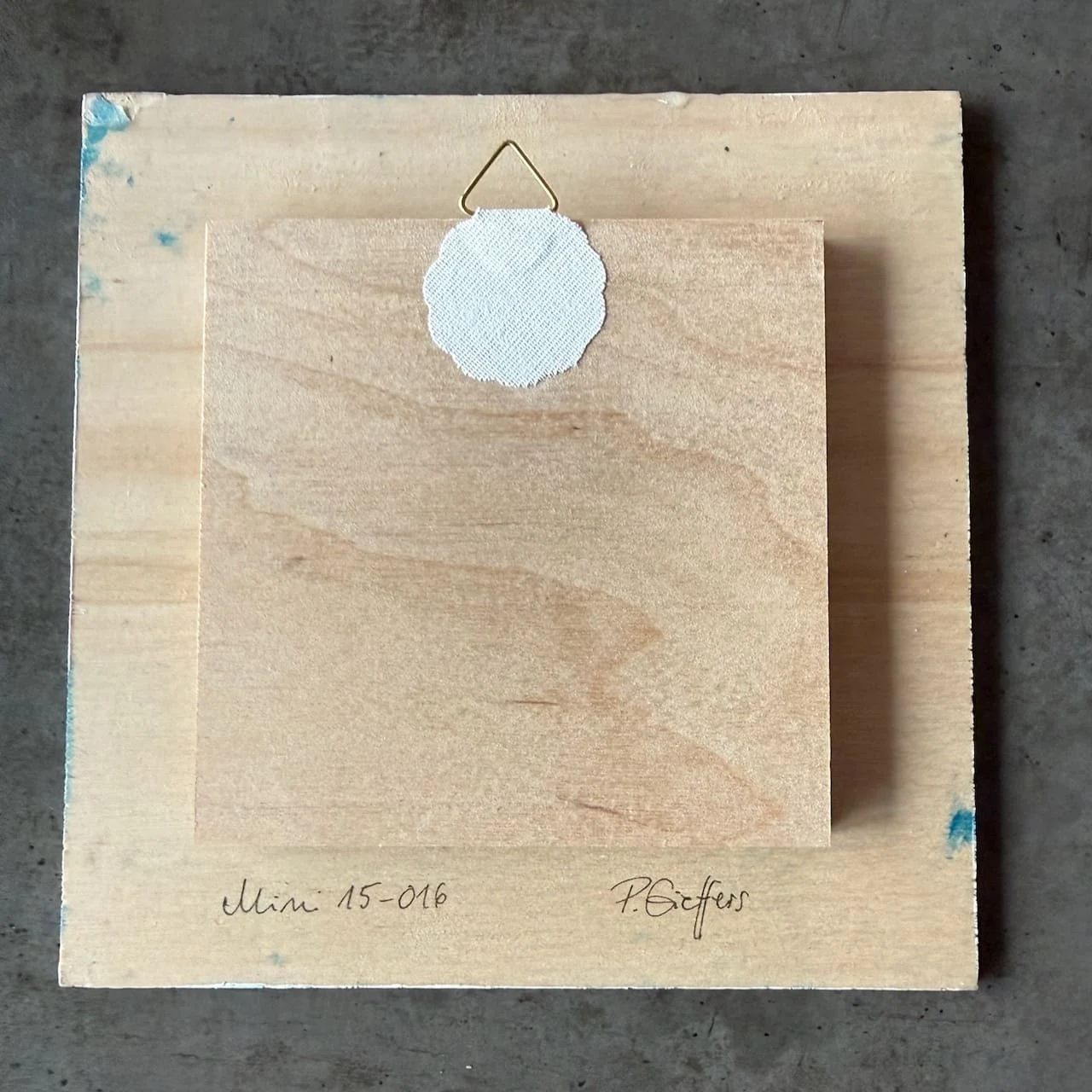Ist ein Mini fertig, bekommt er eine finale Lackschicht, die die Oberfläche schützt und den Farben nochmal Tiefe gibt. Dann wird auf der Rückseite ein kleiner Abstandhalter aus Multiplex angebracht, dazu ein Aufhänger. So steht der Mini später frei an der Wand und liegt nicht auf. Der kleine Abstand zur Wand wirft einen feinen Schatten, und das gibt den Minis ihre Präsenz. Wer mag, kann sie genauso gut ins Regal stellen.