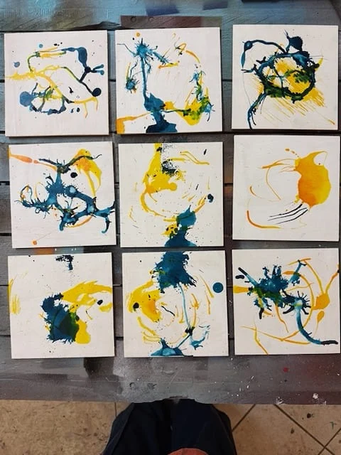 Die Minis entstehen in Mischtechnik aus Acryl, Tusche und Schellack. Ich arbeite in Schichten, meistens an vielen Minis gleichzeitig. Ein Wisch hier, ein Tropfen dort, eine Lasur darüber. Irgendwann beginnt eine Oberfläche zu sprechen.