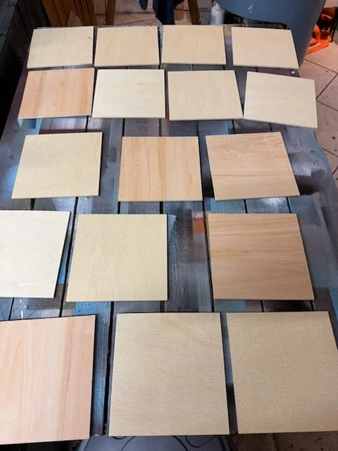 Die erste Charge habe ich auf MDF gearbeitet. Glatte Kanten, einheitliche Oberfläche. Für die zweite Charge wollte ich Nachschub bestellen und habe im Baumarkt offenbar nicht genau genug hingeschaut. Statt MDF bekam ich Multiplex-Zuschnitte. Mit teilweise gesplitterten Rändern.